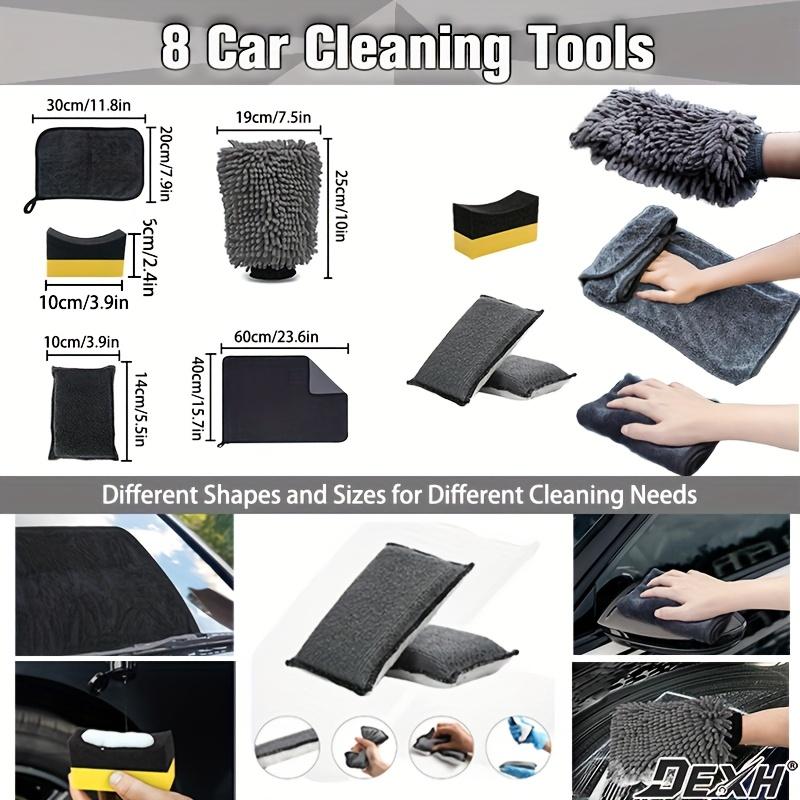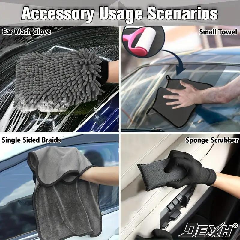 This kit offers a multi-purpose car wash set, suitable for motorcycles and trucks. It includes a soft bristle vent detailing brush set and an ultra-soft microfiber car wash mitt. The set is reusable and perfect for dusting and window tinting. It's a professional care kit for RVs and trucks, ensuring thorough cleaning.