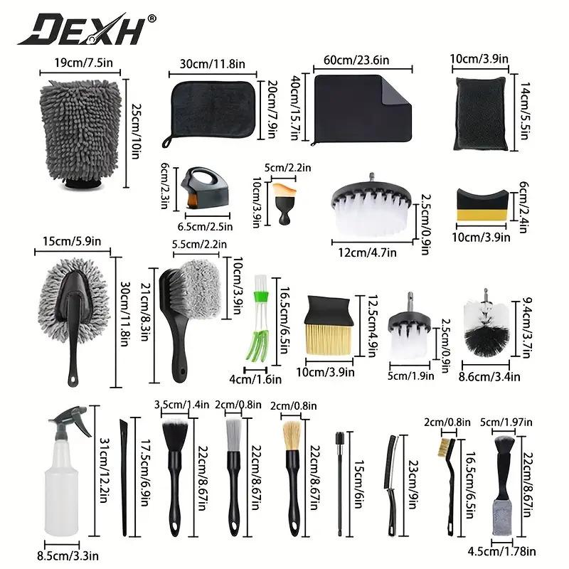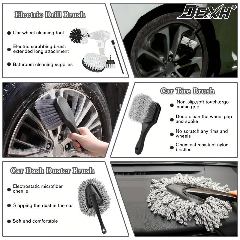 Elevate your car care routine with this comprehensive detailing kit! Perfect for both interior and exterior, it includes a variety of brushes and tools. The set features a drill brush, power scrubber, and a soft car scrub brush. Ideal for wheels, windshields, and air cond outlets. This kit is a must-have for any car enthusiast.